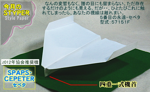 6月2日(土)発行の中日こどもウィークリー第44号に、セペタ90175Fの折り方を掲載しています。中日ウィークリーの紙面では飛行機の名前は載せてありませんがセペタという飛行機で、完成すると上の写真のようになります。上の写真は57151Fというモデルになりますが、90175Fは初号機モデル(88172F)の全長を少し長くしたタイプになります。